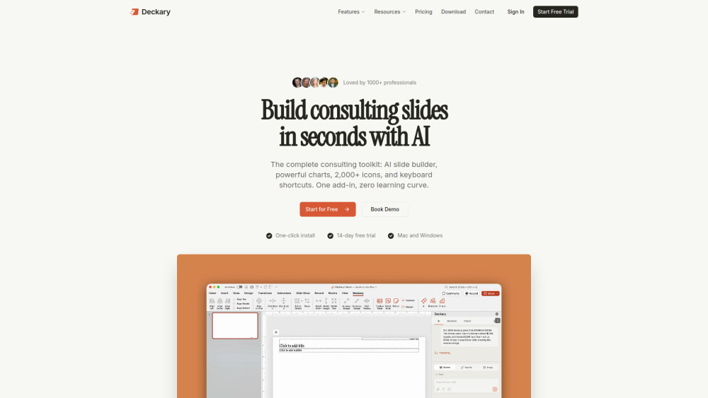 Deckary is a game changer for anyone creating presentations! This PowerPoint add-in uses AI to transform your plain text into professional slides complete with charts and icons. Whether you're a consultant, manager, or educator, it streamlines your workflow by generating polished slides quickly, linking to your Excel data seamlessly, and even providing a library of templates and images to make your work easier.