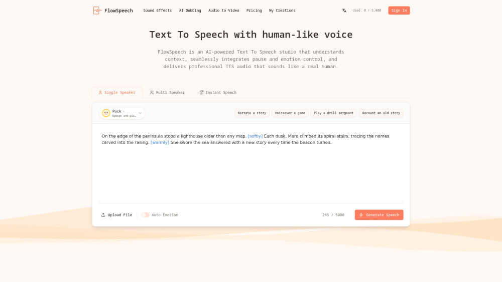FlowSpeech is a game-changer for anyone needing lifelike voiceovers. With its context-aware technology, it delivers speech that sounds genuinely human, making it perfect for educators, marketers, and storytellers alike. From novels to social media videos, it can handle various formats and emotions, solving the challenge of creating engaging audio effortlessly.