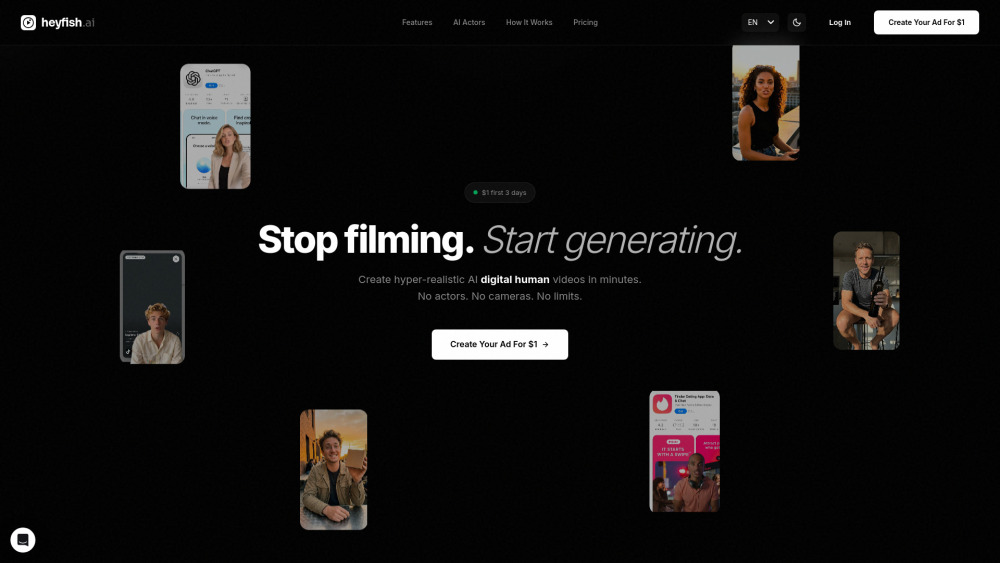 HeyFish AI is an AI-powered UGC video ads platform that Create high-quality UGC-style video ads using single-person and dual-person AI digital humans, built-in ad templates, multi-language support, and 4K video output—optimized for TikTok, Meta, and YouTube.
