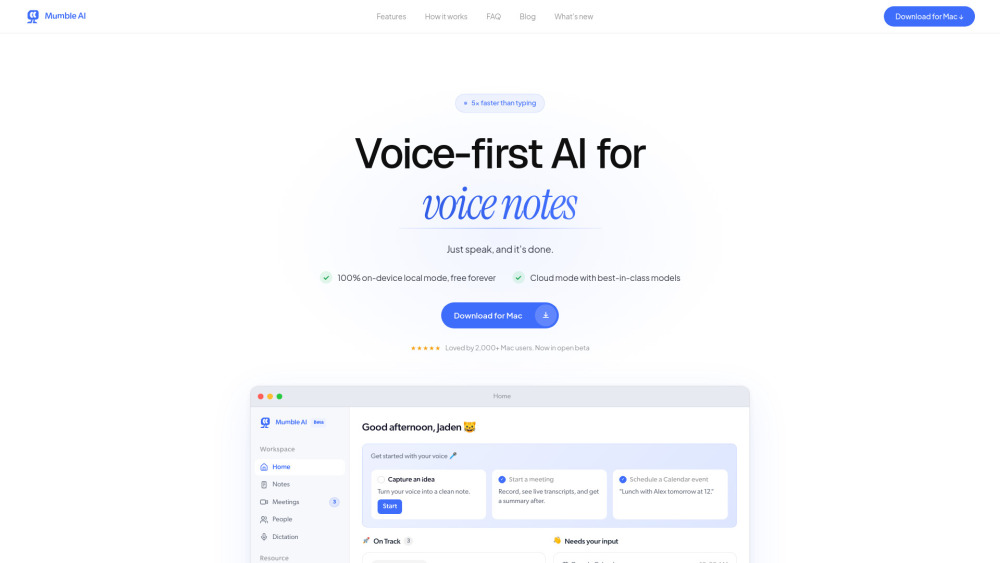 Mumble AI is a voice-first productivity app for Mac that combines meeting recording, dictation, agent and voice notes in one place.
