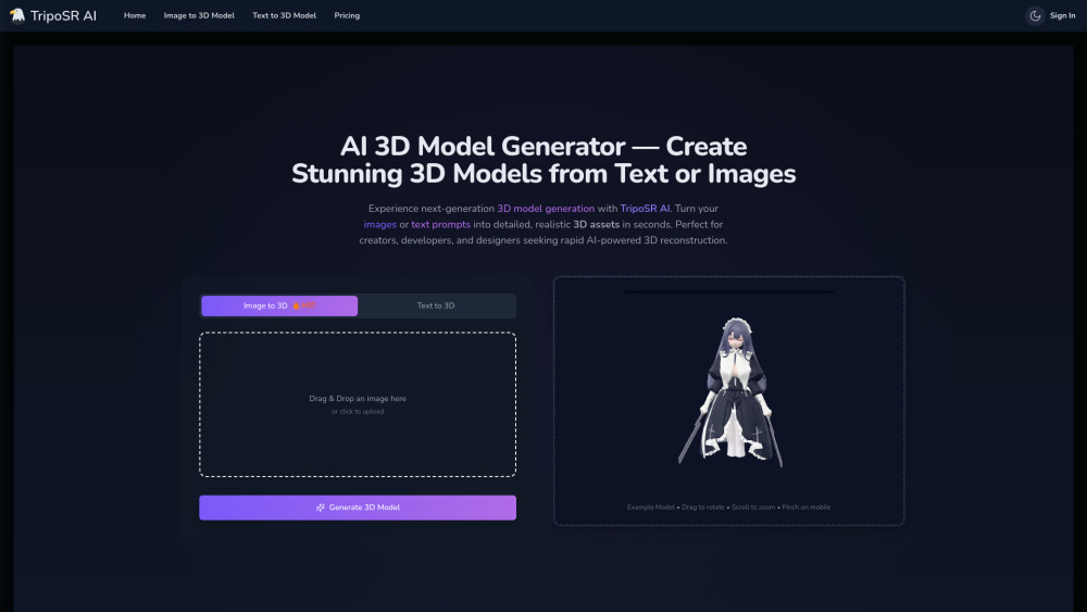 TripoSR is a game-changer for anyone needing quick and high-quality 3D models. Whether you're a designer, developer, or animator, this AI platform turns text prompts or 2D images into stunning 3D assets in seconds! Say goodbye to tedious modeling processes and hello to rapid iterations, perfect for game design, product visualization, and AR/VR projects.